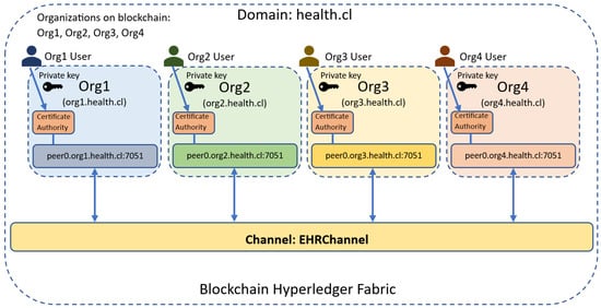 We dispose of a Hyperledger Fabric design with four organizations: Org1 represents the Hospital, Org2 corresponds to the Laboratory, Org3 symbolizes the Research Center, and Org4 represents the Insurance Agency. In HLF, the network requires a domain name which will be health.cl, the initial adaptation scheme (a single channel called EHRChannel and a peer node) of the proposed model to the Hyperledger Fabric architecture is shown in Figure 5.