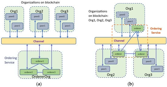 For the execution of the proposed scheme, we deploy the orderer peers per organization and not as a separate group. This alternative way of implementing the network is possible using the RAFT consensus. A striking advantage of this RAFT-based ordering service configuration is that each organization can have its own ordering nodes participating in the service. This provides a higher level of decentralization that is not available in the traditional mode. The difference between these two forms is shown in Figure 6.