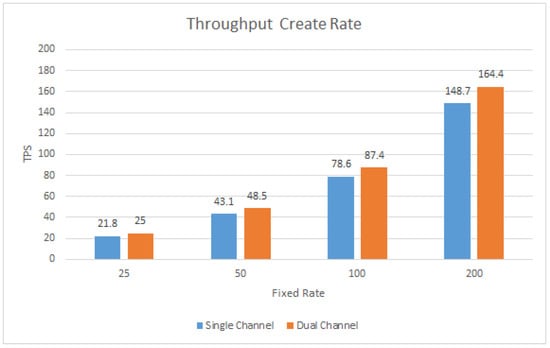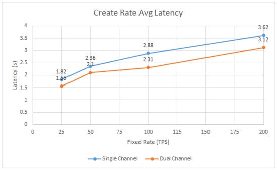 The average latency comparison plots shown in Figure 12 and Figure 13 indicate that, for both Query Rate and Create Rate rounds, latency times are lower when comparing the dual-channel scheme with respect to the single-channel scheme for all data load rates. The most significant improvements occur in the Create Rate round, where the decrease in latency is around 0.5 s. This decrease remains almost constant for all upload rates for the Create Rate round, so it can be deduced that either the TPS does not significantly influence the latency or also the hardware capacity is effective.