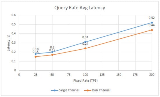 The graph in Figure 13 compares the average latency of the Query Rate round between a single-channel and dual-channel blockchain. In this graph in Figure 13, we observe that the decrease in the average latency of the dual-channel blockchain is more significant for the 100 and 200 TPS sending rates, while for the 25 and 50 TPS sending rates, the difference in the average latency between the one-channel and two-channel network is only 0.03 milliseconds.
