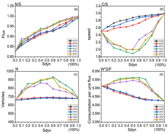 Considering that total consumption of vehicles is related to traffic flow, Figure 3d shows the consumption per unit flux. Global information strategies always performed better than local ones. In each group, the lines of different route guidance strategies almost coincided. Therefore, when , using CCS, MVS or SFS can save energy.