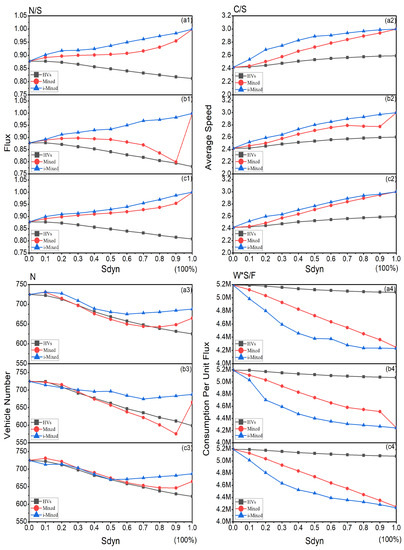 Results of two exits under the global information strategies. (a1) Traffic flux of CCS. (a2) Average speed of CCS. (a3) Vehicle numbers of CCS. (a4) Consumption per unit flux of CCS. (b1) Traffic flux of MVS. (b2) Average speed of MVS. (b3) Vehicle numbers of MVS. (b4) Consumption per unit flux of MVS. (c1) Traffic flux of SFS. (c2) Average speed of SFS. (c3) Vehicle numbers of SFS. (c4) Consumption per unit flux of SFS.