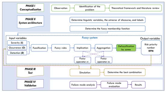 The research methodology is developed in four phases (see Figure 1). The first phase is conceptualization. From the systematic observation, the problem is raised, and the areas of opportunity are identified in the FMEA technique. In addition, the literature review of current research on FMEA and fuzzy logic was carried out. In the second phase, the architecture of the fuzzy evaluation system is carried out. In this phase, we develop the most significant contribution, mainly in the defuzzification stage (highlighted in green). This step will be explained in more detail later.
