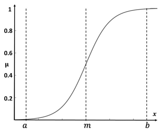 The sigmoid membership function is used to fuzzy the input variables. This function is characterized by having an inclusion value other than 0 for a range of values above a certain point , being 0 below and 1 for values greater than . The inflection point (value 0.5) is . Between points and , it is quadratic type (smooth) [28].