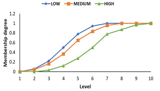 The fuzzy set theory is a mathematical tool to translate abstract concepts in natural language into computational language; it offers a way of dealing with imprecise and vague information. Fuzzy logic refers to the concept of partial truth. The and values represent, respectively, a null and complete membership of in , while all values between 0 and 1 indicate a partial membership of in [27].