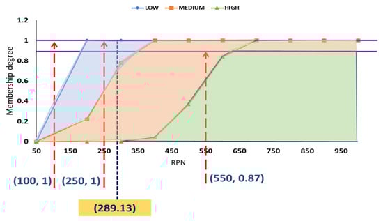 The work of [13] successfully combines fuzzy logic and product FMEA. The triangular membership function and the Mamdani model with max–min operators were used in the fuzzy system. Sixteen failure modes are analyzed in a family farming equipment cutting module to mechanize artichoke processing. The scale of the RPN output variable for the analyzed failure modes varies between (576.35, 833.47). In a numerical example presented by the authors, the output value is practically twice the value of the conventional RPN. In this present investigation, defuzzification is carried out via zones (sets). With the above, obtaining a value in the output variable close to the conventional RPN is possible.