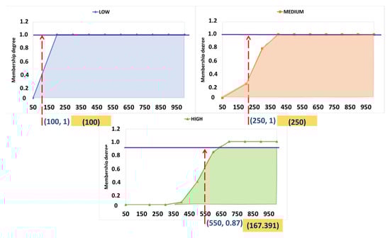 An essential contribution of this research is in the defuzzification stage. When the centroid method is used to obtain the true value of the output, the areas of each set overlap to form a single area. With this, the point where a vertical line will be located that segments the total area into two areas with equal mass is calculated. Our proposal considers each set individually (see Figure 7). In the same way, each function is cut according to its degree of membership. Initially, it was identified that the maximum values mainly come from the output variable of the fuzzy set high (H). In Equation (3), all the sets have the same importance, but the change is that the high set has higher priority since it is the one that marks the difference between the values.