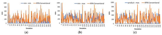 In the simulation stage, random numbers are generated for each factor, and the output values of the defuzzification stage are recorded. Therefore, the system was validated via this simulation process generating one hundred runs, and each run consisted of 200 iterations for each combination of operators. Figure 8 presents the results of only one run, where it is possible to compare the behavior of the system outputs with the evaluation of the conventional RPN. In the three scenarios, an approximate behavior is observed. However, It Is essential to evaluate the performance of the system.