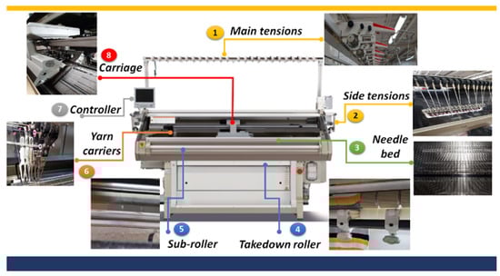 In Figure 9, the location of the subsystems of the knitting machines are shown and named as follows: (1) main tensions, (2) side tensions, (3) needle bed, (4) takedown roller, (5) sub-roller, (6) yarn carriers, (7) controller, and (8) carriage.