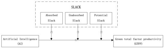 The theory of business behavior asserts that the role of slack resources is crucial in enterprises. First, firms need a certain amount of slack resources to relieve and adapt to the pressure of the external environment, which enhances their external environmental adaptability. Second, the existence of slack resources enhances the flexibility of a firm’s decision making; as the resources available to the firm increase, the firm’s ability to cope with the complex environment—and thereby achieve its diversified strategic goals—increases, and higher levels of slack resources contribute to providing better conditions for the firm’s exploration and innovation [46,47,48]. In addition, slack resources can alleviate internal conflict among the top management of a firm [49]. Finally, the existence of idle resources in a firm enables managers to focus on long-term sustainability, rather than being forced to address short-term poor performance [50]. From the resource-based perspective, a firm’s resources are the source of its competition and development, and slack resources ensure available funds in a complex environment, alleviating the problem of financing constraints and providing opportunities for green growth [51]. As the digital economy continues to develop, the ability of enterprises to reintegrate and reconfigure resources is directly related to their sustainability. According to resource availability, this study classifies slack resources into unabsorbed, absorbed, and potential slack resources [52,53] to explore the impact of different types of slack resources on the relationship between AI and enterprise GTFP.