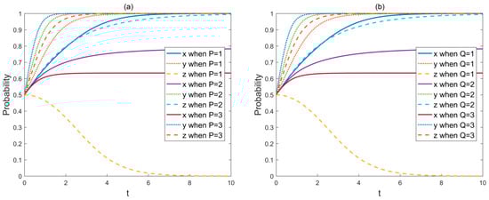 Figure 4 shows that the probability of data trading platforms choosing a governance strategy decreases, while the probability of data suppliers choosing an innovative strategy and data demanders choosing a resale strategy increases, as the price or the number of trades of data trading increases. The price (P) and the quantity (Q) of data trading affect the payment of the three parties indirectly through the game system, as they determine the amount of data trading. Data trading platforms can obtain revenue from any data trading amount, regardless of their strategy. The higher the price and quantity of data trading, the higher the benefit (P Q) and the incentive for data suppliers to choose the data innovation strategy. Data demanders buy data for utility, but they can also profit from reselling data. The higher the value of data trading, the higher the resale revenue (m P Q). This implies that more data trading may lead to more frequency and circulation of data resale, which may reduce the effectiveness of platform governance and increase the difficulty of regulating data trading.