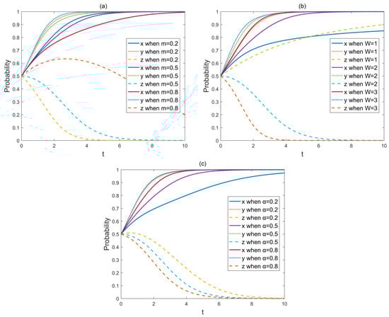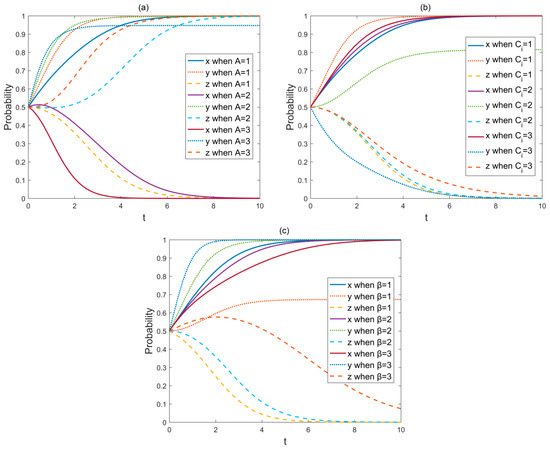 In reference to the relevant research [34,35], the correctness of the analysis was further tested through a numerical simulation to reveal the stability of the equilibrium strategy of the evolutionary game with different factors influencing the elements and to seek insights into the governance of data resale behavior in data trading. Considering that (1, 1, 0) is the ideal equilibrium state when the data trading platforms govern, the data suppliers innovate positively and the data demanders do not sell data, the conditions that must be satisfied are A + Cg − D < 0, −A + Ci + P (Q − Q β) < 0 and −W + m P Q β < 0. Based on this set of parameters, Cg = 1, D = 3, A = 1, W = 2, Ci = 1, P = 1, Q = 1, β = 2, m = 0.5, α = 0.5, x = 0.5, y = 0.5, z = 0.5, and the simulation period was set at 10.