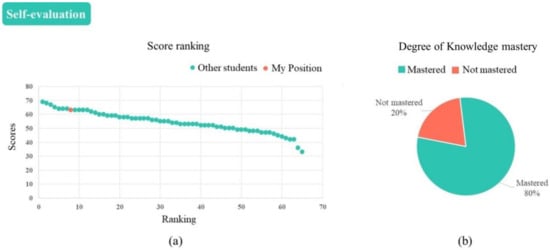 Self-evaluation module. (a) Score ranking: Students’ scores are on the Y-axis; students’ class rank is on the X-axis; (b) degree of knowledge mastery: The green area represents the percentage of knowledge a student has mastered, while the red area represents the percentage of knowledge not mastered by the student.