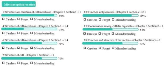 Based on our research results, we found that the misconception location function and degree of knowledge mastery were the types of feedback most needed by teachers and students. The function of misconception location is difficult to obtain through student analysis and is rarely seen in their usual learning, so students found this function particularly useful. The degree of knowledge mastery is a partial summative assessment that allows students to recognize the gap between their current understanding and their goals as a whole, which better motivates them to learn [].