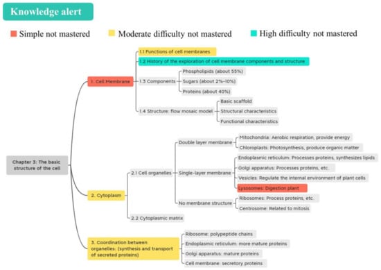 This part of the knowledge alert system uses knowledge tracking technology. An intelligent learning diagnostic experiment platform was built, as shown in Figure 3, which derives the students’ mastery of each knowledge point. The value obtained by dividing the student’s mastery of the knowledge point by the class’s correct answer rate for the knowledge point determines whether a warning needs to be given for the knowledge point. A traffic light approach is used in the visual presentation: Red represents simple knowledge not yet mastered, yellow represents moderately difficult knowledge not yet mastered, and green represents highly difficult knowledge not yet mastered; this is combined with the knowledge map to create the knowledge alert, as shown in Figure 4.