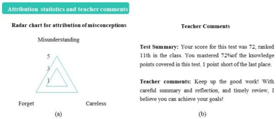 Motivational module. (a) Radar chart for misconception attribution; (b) teacher comments.