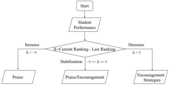 For the technical realization logic, we took the difference between the student’s current ranking and the last ranking; if the resulting value is greater than five, the student ranking is judged to have decreased, but if it is less than minus five, it is judged to have increased. Other cases are considered stable. Praise and encouragement rubrics are then generated based on whether the student ranking has increased or decreased. For students who remained stable, praise is given if they are in the top 50% of the rankings, while for others, encouragement is given. The logic flow chart is shown in Figure 6.
