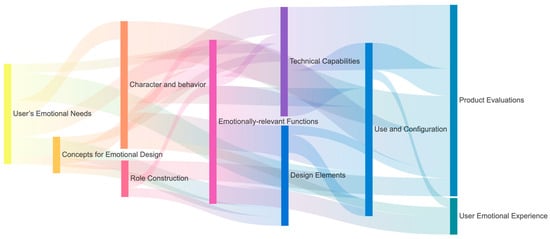 With the addition of two interviews and three product cases, our theoretical saturation test indicated that the current model did not continue to generate new concepts or categories. Also, we extracted 75 statements describing the emotional design thinking of smart products from the original data, enumerated their causal relationships, and represented them with Sankey diagrams using eCharts. Through this diagram in Figure 3, it is easy to see that the present model largely matches the design logic implied by the original data. As a result, our model for smart products’ emotional design is largely saturated [71].