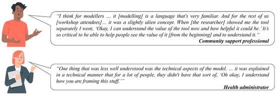 Although most participants conveyed that they felt respected during the process, another area for improvement was how information was presented to stakeholders. Figure 3 demonstrates how modelling language and technical aspects could be alienating for participants, many of whom lacked prior knowledge and experience of modelling. It was, therefore, “critical” that time was taken to enable participants to understand the value of the tool. In addition to providing less technical explanations, community support professionals and health administrators suggested that demonstrating what the model could tangibly look like at each of the three workshops would improve engagement throughout the PSM process, as stakeholder engagement varied and new registrants attended each workshop.