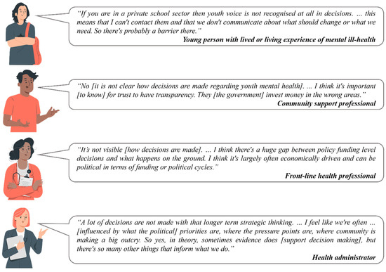 There was consensus in the baseline and follow-up interviews on the importance of improving the health and well-being of young people in the ACT through better policy decisions. As interviews allowed for further probing of the responses, systemic challenges impacting youth mental health in the ACT were identified. The challenges identified were similar across the participant stakeholder groups, with a common theme being that transparency was lacking around system-level decision-making regarding youth mental health in the ACT. In Figure 4, quotes from participants occupying different roles within the system convey a lack of transparency regarding how decisions are made. This suggests stakeholders sensing a “barrier” in understanding who has the power to make decisions to strengthen the youth mental health system in the ACT, which was further emphasized in the follow-up interviews, as discussed below. Further and notably, there were different views about where responsibility for decision-making was placed across the stakeholders. For example, young people with a lived experience of mental ill-health placed responsibility on front-line health professionals or community support professionals, professionals placed responsibility on health administrators, and administrators placed responsibility of ultimate decision-making power at a level above their role (such as the Minister for Mental Health or the federal government).