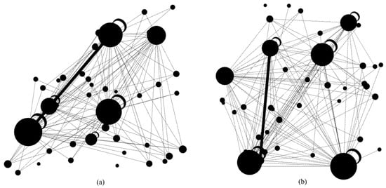 Baseline (a) and follow-up (b) social network diagrams. Circles represent nodes (stakeholder organisations) and the lines represent edges (strength of collaboration between stakeholder organisations). Circle size and line thickness are proportional to the strength of the relationship.