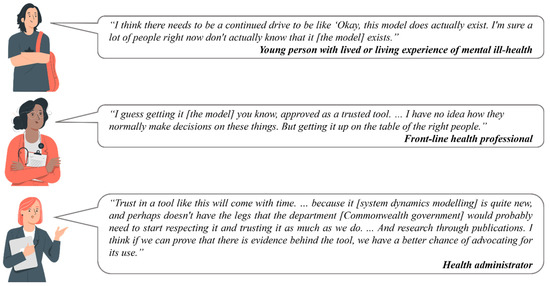Most participants expressed hope that the model would be sustainably used to support decision-making for youth mental health systems policy and planning decisions. Although participants saw value in the PSM process in that “the co-design makes me more willing to use the model because I understand it more”, participants also expressed that more awareness of system dynamics modelling as a method is required in the youth mental health sector, to increase recognition of the model as a legitimate tool to support decision-making in youth mental health policy and planning in the ACT (Figure 7).