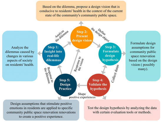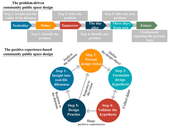 People can develop positive experiences by experiencing more positive emotions in their daily lives [66]. The positive experience is derived from positive psychology [69], aiming to push traditional psychology away from focusing only on fixing the worst things in life and toward building positive qualities. An experience is often a special experience for a subject, which is often reflected in the experience itself or the process of experience that stimulates the subject to generate a special emotion or meaning, which is remembered or shared. It is a positive experience when the emotion or meaning brought about by an experience is positive. Positive experiences are a core component of well-being, and have a significant positive impact on an individual’s subjective well-being [70]. Although the theory has been widely applied in multiple industries, it has not been applied to the design of community public space environmental systems. In fact, the existing approach to renovating modern community public spaces is essentially a problem-driven design. The design approach tends to focus on a specific and well-defined design problem, so the design path is linear, which is an ongoing process [71]. However, with the development of society, environmental problems in community public spaces, in reality, are becoming more complex and diverse. Problem-driven design often loses its ability to address these issues in the face of new social changes and may even result in new problems. Excitingly, the design approach that focuses on positive experiences may offer new hope for current design efforts because its point is to support existing possibilities and create new ones in the design process [72]. This logic of rethinking the design mission to propose a new design solution based on positive experiences could provide a valuable research direction for designing modern community public spaces (Figure 1).