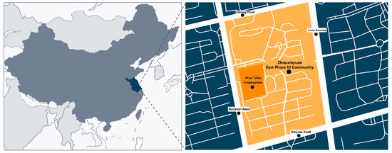 In order to verify the effectiveness of the above framework, a modern residential community in Wuxi was chosen as a typical case study. The case study is based on the Zhouxinyuan East Phase III Community (hereafter referred to as Zhouxinyuan community, Figure 3) in Binhu District, Wuxi (a highly developed industrial and commercial city in the southeastern part of Jiangsu Province, China), which was completed in 2007 and brought into use in 2010. Currently, there are about 1600 families in the community. A residential community such as this one can be found in almost all cities in China, and it can be considered an ordinary and typical modern community. Therefore, the community meets all the research requirements of the study, and we regard it as a typical case study.