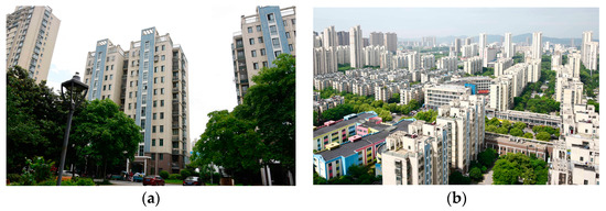 (a) A residential building typical of Zhouxinyuan community. (b) Residential facades near the Zhouxinyuan community.