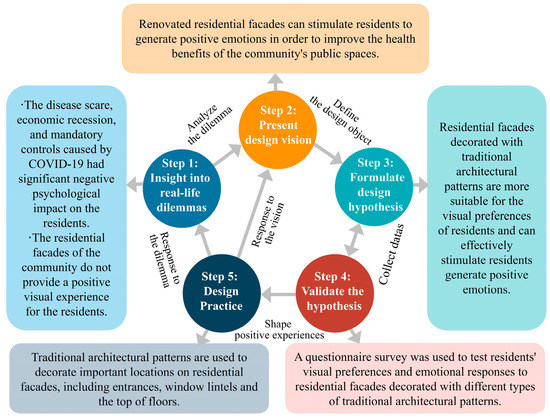 Therefore, our design vision is to shape a positive community public space experience by renovating the residential facade, thereby improving the health benefits of the community public space. The design hypothesis is that the application of traditional architectural patterns to the renovation of the residential facades might stimulate positive emotions among the residents, resulting in an improvement in the health benefits of the community’s public spaces (Figure 5). Notably, our design approach is not intended to achieve the purpose of renovating the facade by demolishing the existing building to rebuild a new one or changing the original building structure. Such design practices not only cause a waste of existing building resources but also add a huge expenditure of additional resources and disturb the daily lives of the residents.