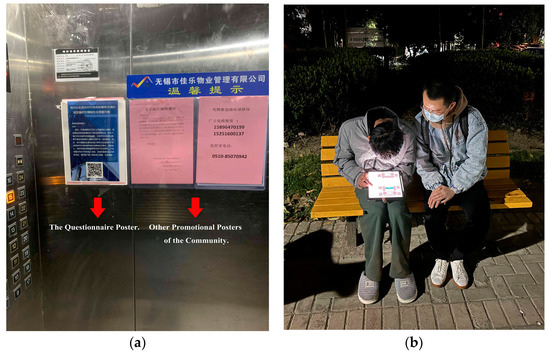 The survey was conducted in the last two weeks of February 2023. The initial plan was to recruit volunteers to conduct a field experiment in the Zhouxinyuan community, but because the community residents had just experienced the first wave of the omicron virus strain since decontrol (6 December 2012), most of them were still afraid to contact strangers or gather with multiple people and increase the risk of infection. Therefore, we finally decided to use an online and offline random sample questionnaire for data collection. The use of questionnaires to measure human emotional responses has been proven to be effective [86,87]. We designed and edited the questionnaire on Wenjuanxing (https://www.wjx.cn/login.aspx) (accessed on 12 February 2023). The online survey was conducted by printing the questionnaire’s QR code and posting it on the bulletin board in the elevators of residential buildings for residents to fill in voluntarily (Figure 6), as elevators are how almost all residents navigate the building every day. The offline study was conducted at different times of day (especially after dinner, as we observed that the residents’ outdoor activity peaked after dinner) by randomly selecting residents in the neighborhood to fill out the questionnaire on an electronic terminal (iPad Pro 2019). To clarify, respondents who filled out the questionnaire offline saw the same stimulus material, including the same brightness level, size, and color of the images because they did so on the same electronic terminal, which we provided. Respondents who completed the research questionnaire online may have been affected by the resolution of the electronic terminal they used. Nevertheless, since we also have detailed text descriptions in the questionnaire, which could help the respondents understand the answered questions, the resolution of the electronic terminals employed by the respondents themselves would not significantly affect the final test results.