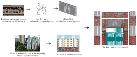 In this study, two sets of visual stimulus materials were used: residential entrance walls decorated with different types of traditional architectural patterns and the original residential entrance walls in the community (which were not decorated with any traditional architectural patterns). The development process comprised the following stages (Figure 7): First, we collected various types of traditional Chinese residential architectural patterns from different literature sources [78,79,80,81,82] and field research. Then, we selected sixteen of the most representative traditional architectural patterns from the collected patterns based on the introduction of some literature sources, sketched them using CAD (2022), and imported them into SketchUp Pro (2021) for 3D modeling. In the third step, a typical house in the neighborhood was modeled in 3D using SketchUp. The fourth step was to combine the architectural pattern model with the residential model in SketchUp to produce the initial visual stimulus material. Finally, the preliminary visual stimuli were optimized, adjusted, and exported to the final visual stimuli (the size of the final visual stimuli was 2226 × 1788 pixels, as shown in Figure 8).