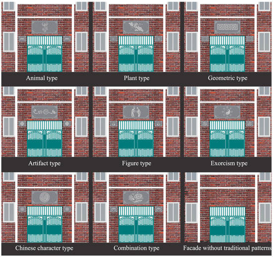 Final visual stimulus materials: the first eight are the residential entrance space facade decorated with different types of traditional architectural patterns, and the last one is the facade without any traditional pattern.