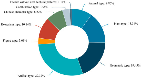 Previous studies have indicated that certain specific architectural patterns can have numerous beneficial psycho-physiological effects on people, such as fractal architectural patterns [74,75] and natural architectural patterns [76]. Unfortunately, the role of traditional architectural patterns in the aesthetic assessment of modern residential public space facades has yet to be researched in academia. As an important part of traditional architectural decoration, traditional architectural patterns are a significant symbol of traditional culture [77]. In particular, traditional architectural patterns contain a wealth of auspicious cultural meanings (Table 1), which can give rise to many beautiful associations [78,79,80,81,82].