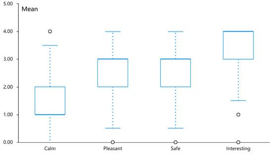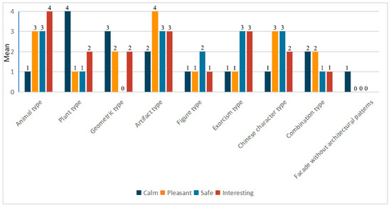 The four mood indices (calm, pleasant, safe, and interesting) were measured on a linear 5-point Likert scale ranging from “not at all,” “a little,” “moderately,” “quite a bit,” to “extremely,” which were converted into numerical ranges 0–4 for statistical analysis. The results (Figure 11) show that residents were most likely to feel “calm” about the plant type (Mean = 4, SD = 1.039), followed by the geometric type (Mean = 3, SD = 0.896). The artifact type was shown to be the most likely to create a “pleasant” feeling (Mean = 4, SD = 0.986), followed by the Chinese character type (Mean = 3, SD = 0.788). Even though the animal type, artifact type, exorcism type, and Chinese character type have the same median safety index (Mean = 3), by comparing the average of these four types of residential facades, we found that the animal type is the most stimulating for residents in terms of feeling safe (Mean = 3, = 2.649), followed by the exorcism type (Mean = 3, = 2.608). People felt “interesting” the most about the animal type (Mean = 4, SD = 0.941), followed by the artifact type (Mean = 3, SD = 0.788).
