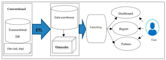 In Spatial Decision Support Systems, spatial datacubes are broadly deployed as common repositories where data sources are integrated and stored. In order to integrate data into a spatial datacube, a complex Extract-Load-Transform (ETL) process is typically used. ETL process consists of cleaning and unifying data extracted from multiple sources. Then, spatial data are stored and managed mainly according to a multidimensional structure (i.e., datacube). Eventually, the data is used by different tools (e.g., spatial OLAP tools and mining tools) that allow decision-making analysis and reporting [8,11]. Figure 1 shows the typical architecture of a spatial DSS, which includes three major parts that consist of ETL process for extracting transforming and loading data into the datacube, organize data in a multidimensional structure, and exploiting data to generate interactive dashboards and analysis reports.