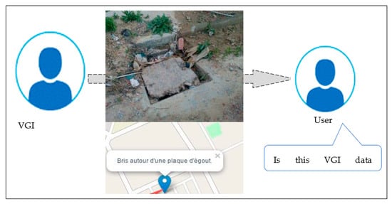 The completeness indicator illustrates the number of VGI data elements relevant to the specific requirements of a decision-making process. A data element is defined as {element nature, element type, element value}, where ‘element nature’ signifies whether it pertains to data or metadata, and ‘element type’ indicates whether the data represents a feature, an attribute, or a relationship. The ‘element value’ corresponds to the actual representation of the element. For instance, the data ‘broken manhole on a road’ has a value that comprises both text and an image. An example of a metadata element related to the data ‘broken manhole on a road’ is the reference system related to spatial coordinates. A missing information about the reference system leads to an incomplete VGI data, which may affect data analysis and~exploitation.