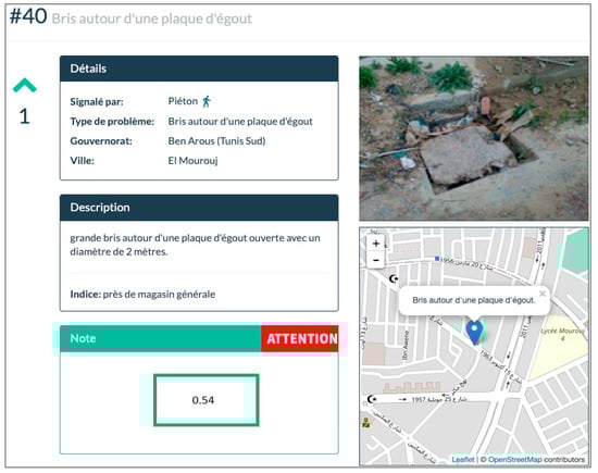 We used a set of VGI reports sent by 20 contributors. The reports contain images and textual information that are used to describe present manholes, potholes, bad roads, and other road deterioration aspects located in different areas of Tunisia. Using our Map-Report prototype, we evaluate the quality of each report. The evaluation process selects a set of reports based on the sample-building methodology of Miller and Charles [39]. Specifically, the evaluation involves 30 reports, divided into three categories: 10 reports with high-quality levels (0.75 < Q ≤ 1), 10 reports with a medium-quality levels (0.5 < Q ≤ 0.75), and 10 reports with a lower-quality levels (Q < 0.5); The quality assessment is carried out using our Map-Report prototype.