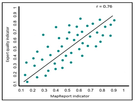In order to evaluate our VGI quality assessment proposal, we employed the commonly used Spearman correlation method, designed to gauge the strength and direction of a relationship between two ranked variables [40]. In our evaluation, we assessed the correlation between two assessments: (1) the VGI quality assessment from the Map-Report prototype and (2) the quality assessment by road maintenance experts. The correlation analysis results are depicted in Figure 5, indicating a Spearman’s coefficient value of 0.76. This value signifies a strong positive correlation between the quality evaluations conducted by the experts and our VGI quality assessment, which demonstrates the efficiency of our approach in presenting good VGI quality assessment.