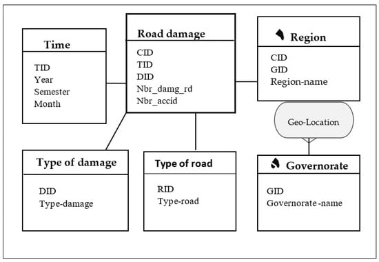 In order to demonstrate the utility of our approach, we created a spatial datacube with which we intend to integrate only VGI data that is high quality. This datacube aims to enhance decision-making based on the number of damaged roads and number of accidents. The datacube stores the number of damaged roads according to the following dimensions: type of damage, location, time, and type of road. Spatial dimension ‘geo-location’ contains the governorate-region hierarchy; a governorate can contain one or more regions. The spatial datacube is modeled based on Malinowski and Zimányi’s conceptualization of spatial data warehouses conceptualization of geospatial data warehouses [41]. Figure 6 shows the multidimensional schema of the developed datacube. This schema allows for the storing and analyzing of data regarding damaged roads in different areas of Grand-Tunis, for different type of roads (e.g., primary, secondary, and residential), and during different periods of time.