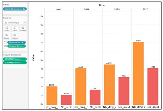 In order to exploit datacube, we used MDX (Multi-Dimensional Expression) language to define queries which are used to select desired data from datacubes. The queries’ extracted data is used to perform analytical analysis regarding the maintenance of damaged roads in Grand-Tunis, and to create reports, such as diagrams, pie graphs, map visualization, and so on. Figure 8 shows a bar chart displaying the total number of damaged roads and accidents from 2017 to 2020 in Grand-Tunis.