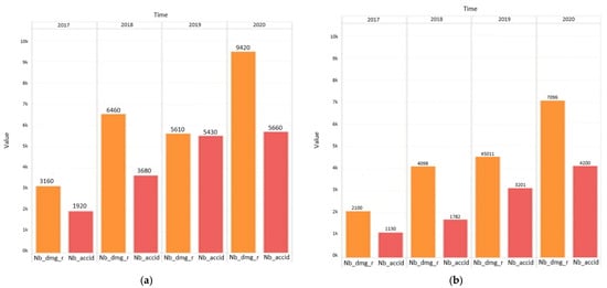 (a,b). Number of damaged roads and accidents from 2017 to 2020 in Grand-Tunis.