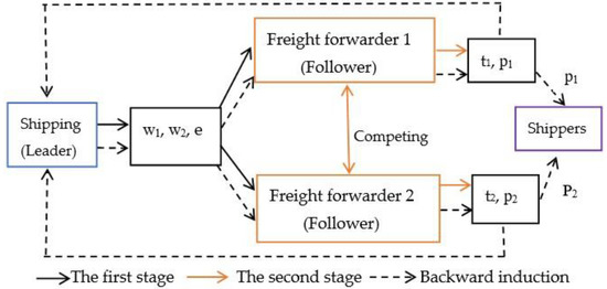 In this section, the study focuses on determining the equilibrium solutions of all parties’ decisions when the two freight forwarders are completely self-interested. The Stackelberg game between the shipping company and freight forwarders is carried out in two stages. (1) The shipping company, acting as the leader, prioritizes the shipping prices () and the brand value (), and (2) according to the decision making of the shipping company, the two freight forwarders as followers decide their own effort levels for extending the brand value () and the freight service prices (). The goal of all parties is to maximize their profits, as illustrated in Figure 1.