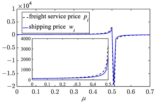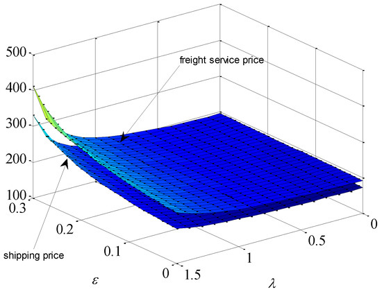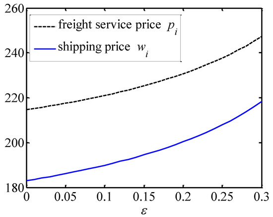 According to Formulas (29) and (31), we have and . Thus, the optimal shipping prices of the shipping company and optimal freight service prices of the freight forwarders are positively correlated with the shippers’ brand preference. This indicates that high brand preference of shippers brings in high shipping prices and high freight service prices.