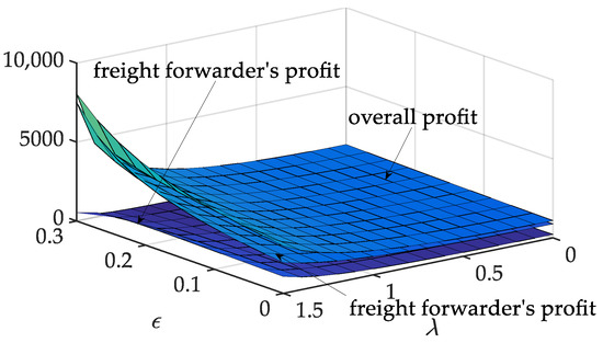 According to Formulas (32), Formula (33) can be rewritten as . This shows that market demands are positively related to the freight forwarders’ effort levels. That is, the higher the freight forwarders’ effort levels, the more effective they are in stimulating market demands. Because the increases of their effort levels can attract more customers, the market demands will increase. From a management perspective, this implies that the increase in the investment to extend the brand value can increase market demands, which is beneficial for the increase of profits for all parties.