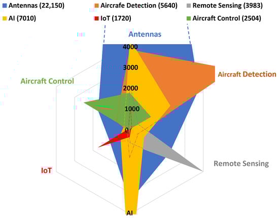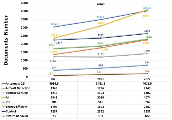The acceleration of growth shown in Table 3 demonstrates a high degree of efficacy in predicting the areas of interest that attract significant attention from researchers in the UAV domain. These predictions offer a nuanced perspective of the developments and trends within the field. For example, the antenna field has a considerable number of publications and an impressive growth rate of approximately 980 new documents per year. However, its growth ratio remains relatively constant at 1.20. In contrast, the field of remote sensing experiences a remarkable surge in interest each year, as reflected by an acceleration in the growth ratio of 9.08. Consequently, these findings provide valuable insights into the most promising research directions within the UAV domain.