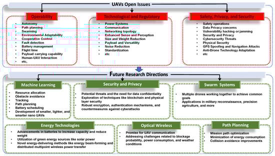 The open development axis for UAVs involves creating a collaborative ecosystem where developers, researchers, and users can work together to build open source platforms, tools, and standards for UAV design, development, and operation. This approach allows for greater innovation and flexibility in the UAV industry [], including the integration of AI and ML algorithms to enhance autonomous flight and decision-making capabilities [,]. Further challenges and open research directions can be elaborated upon in the following points.