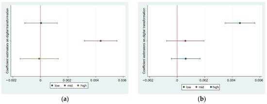 First, based on the results in Figure 3a, we find that the coefficient on digital transformation is significantly non-zero only in the group with a moderate level of market competition (), while it is not significant in both the groups with lower and higher levels of market competition. It is not the case that the effect of digital transformation on green supply chain development is stronger in regions with higher levels of market competition, which does not support Hypothesis H1.