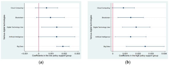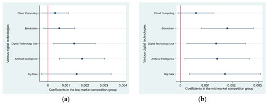 Third, in order to analyze the different impacts of different digitization technology types, we replace the independent variable (DT) with sub-indexes as described in the Section 4.1. Figure 4 displays the performance of the sub-indexes in different market competition levels, where Figure 4a,b show the coefficients corresponding to each type of sub-index with 95% confidence intervals in the low market competition level and medium market competition level, respectively.