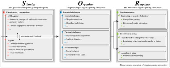 In this section, we interpret the negative atmosphere in MOBA games through the lens of Mehrabian and Russell’s Stimulus–Organism–Response (S-O-R) theory [48]. From the environmental psychological perspective that S-O-R advances, a negative gaming atmosphere can be divided into three stages: (1) Stimulus, (2) Organism, and (3) Response (Figure 1).